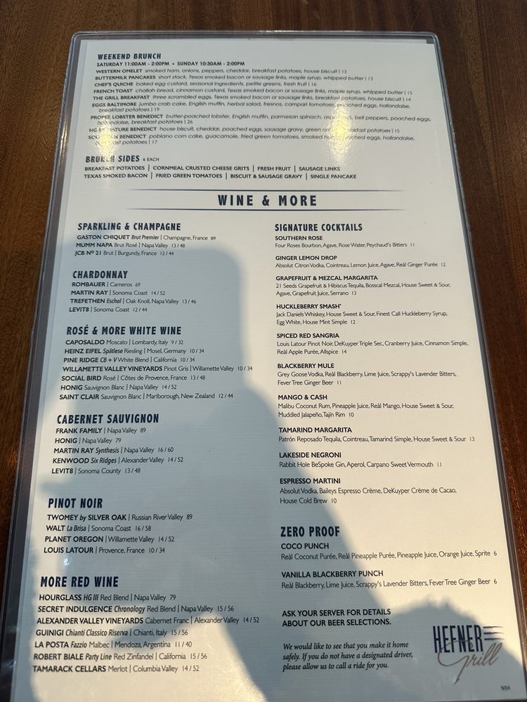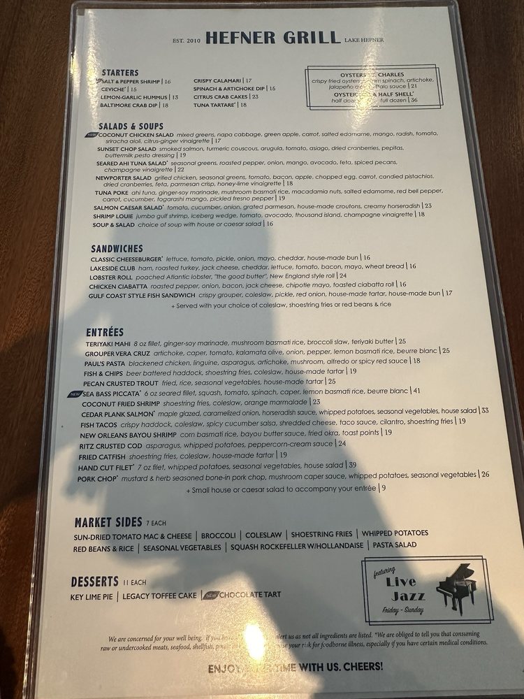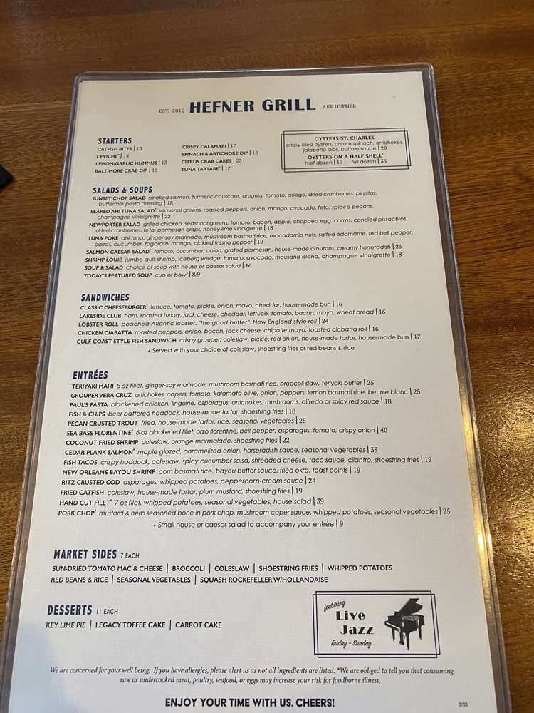 Introducing the menu at Hefner Grill, located in Oklahoma City, offering a mix of seafood, American cuisine, and steakhouse favorites. Known for its upscale yet casual atmosphere, the restaurant provides a range of dining options including brunch, lunch, and dinner, along with happy hour specials. With a focus on quality and flavor, Hefner Grill offers a variety of vegetarian options and caters to a diverse range of preferences. Customers have raved about the Coconut Shrimp, lobster roll, fish sandwich, and unique dishes like Fish Ribs in spicy Asian sauce. The restaurant also boasts scenic views of Lake Hefner, live music, and attentive service. Whether you're looking for a place to dine with friends, family, or for a special occasion, Hefner Grill delivers a memorable experience for all.